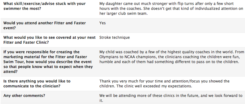 I thought it was great! I learned alot. My starts improved imediately. Chloe Sutton explained everything very clearly and helped everyone. I would recommend a Fitter and Faster swim clinic to anyone. I loved the swim clinic and hope to go to another one soon.