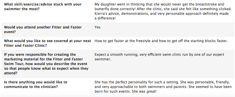I genuinely value the time and attention the clinician’s took to give the swimmers as much individualized attention as possible. I am always delighted by these amazing athletes’ enthusiasm and patience when working with these young swimmers. Today was a unique experience because for the first time my child was able to work with a coach that has trained on the Olympic level. Our family is reading Missy Franklin’s book and so it meant so much to not only meet Todd [Schmitz], but get a chance to work with this passionate coach. This was a stellar line up. Thank you!